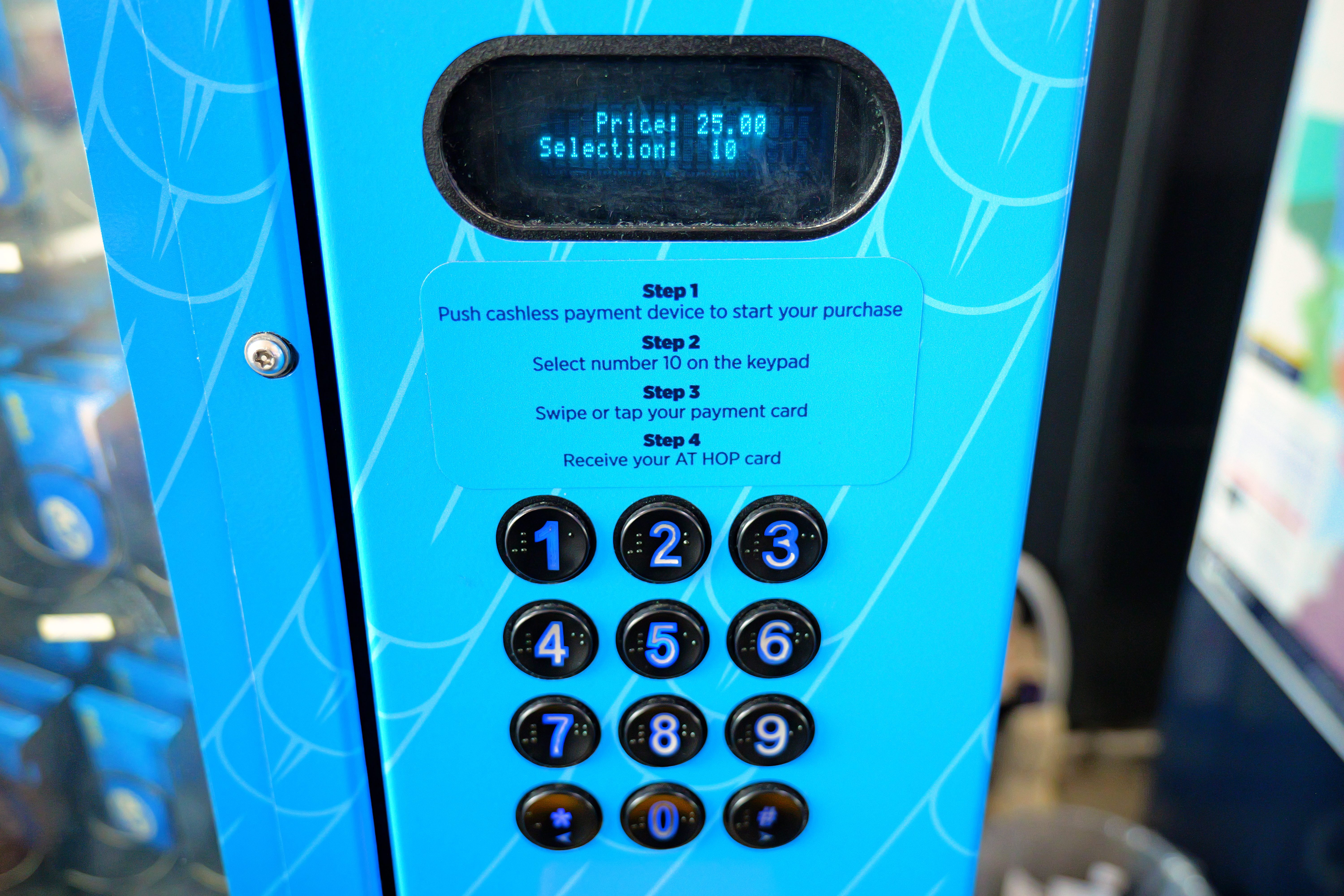 入力した番号の棚から商品が落ちてくるベンディングマシンで、全ての棚に『AT HOPカード』が入っていることも確認しました