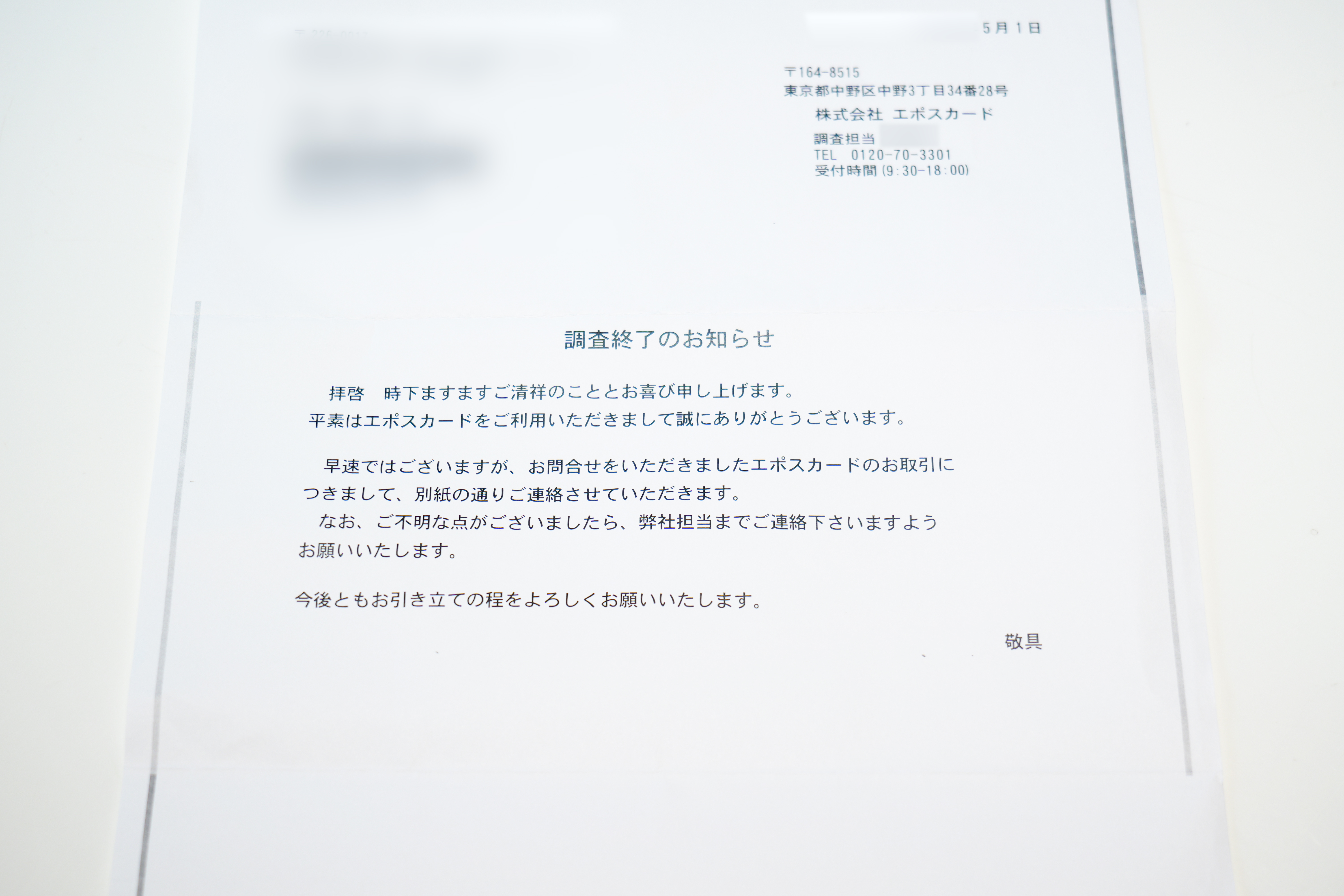 調査期間を経て、エポスから調査結果が書面で届きました